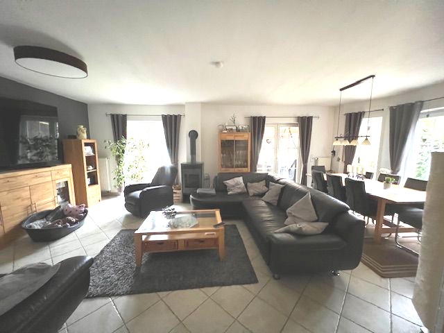 Über eine Stufe gelangt man in die großzügige Diele. Von hier sind alle Räume des Erdgeschosses zugänglich. Der knapp 32qm Wohn/Essbereich bietet vom Wohn- sowie vom Essbereich Zugang zum anliegenden Garten. Durch die bodentiefen Fenster wird der Raum optimal mit Tageslicht versorgt. Der vorhandene Kamin sorgt zudem für ein wohliges Ambiente. Die anliegende Küche ist durch einen breite Öffnung mit dem Wohn-/Essbereich miteinander verbunden.