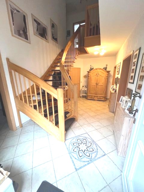 Die Küche ist mit einer gepflegten Einbauküche mit cremefarbenen Hochglanzfronten ausgestattet. Platz für einen Esstresen ist zudem vorhanden. 1,5 weitere Zimmer, das Gästebad mit Dusche sowie der HWR befinden sich auf gleicher Ebene. Über eine massive Buchentreppe gelangt man zum Obergeschoss. Hier sind 4 weitere schöne Zimmer sowie das Hauptbad gelegen.