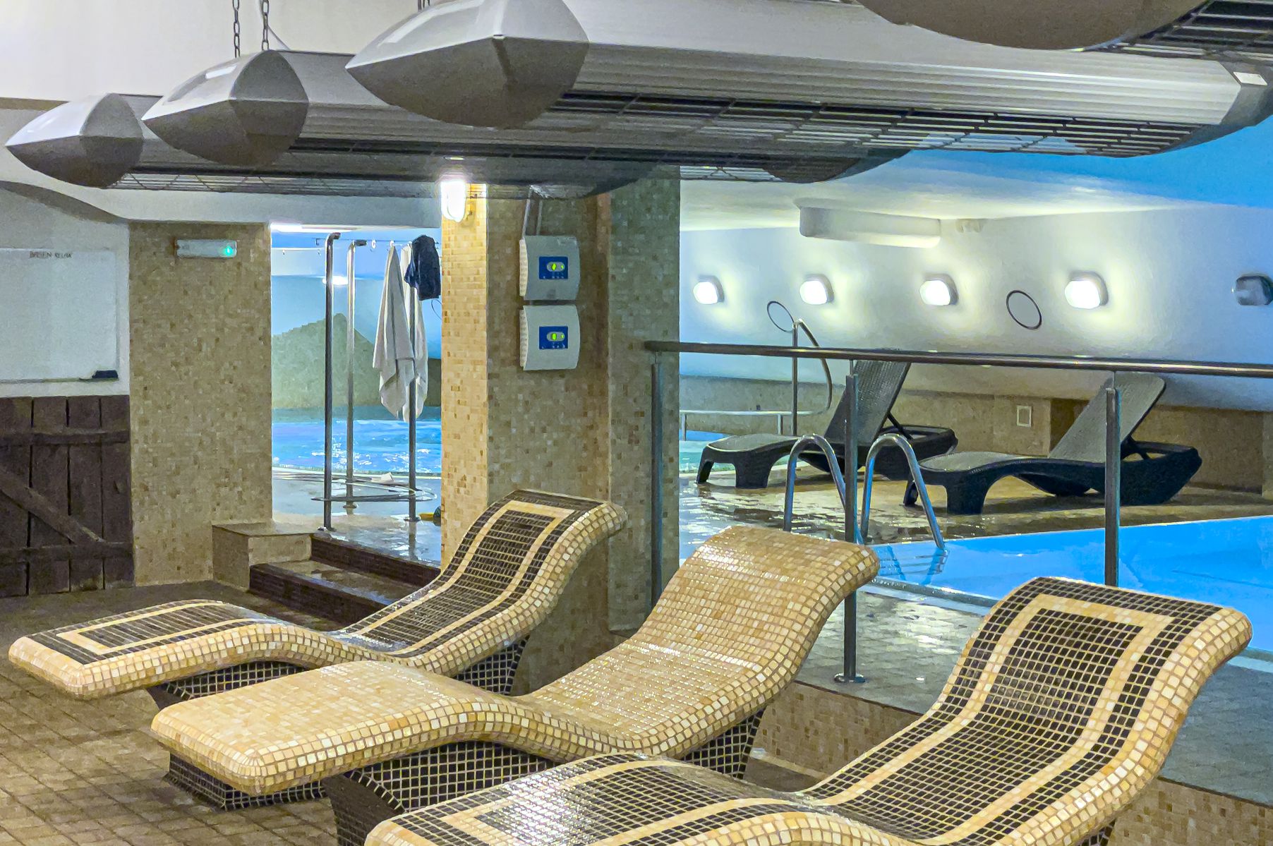 Der Spabereich bietet nebem zwei Pools, einen Whirlpool, Sauna, Dampfbad sowie eine Salzgrotte. Das Hotel bietet zudem diverse Kosmetik- und Wellnessangebote wie Massagen, Maniküre usw.